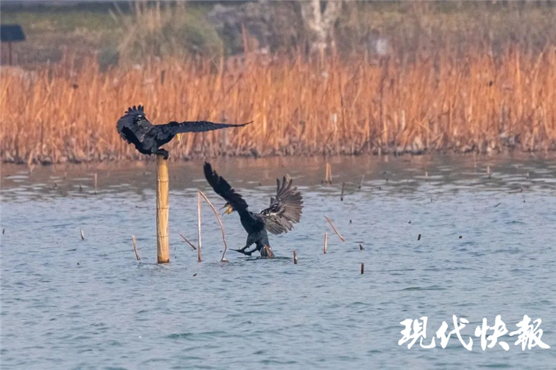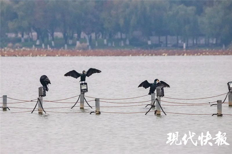現(xiàn)代快報(bào)記者在湖畔看到,一大群鸕鶿棲息在湖面的圍欄上,或是伺機(jī)捕魚,或是展開翅膀晾曬羽毛,烏黑的羽翼在陽光下泛著光澤。記者了解到,從11月初起,鸕鶿就會(huì)準(zhǔn)時(shí)來玄武湖過冬,進(jìn)入12月數(shù)量開始增多,每年都在50只以上,多的年份會(huì)超過100只。
