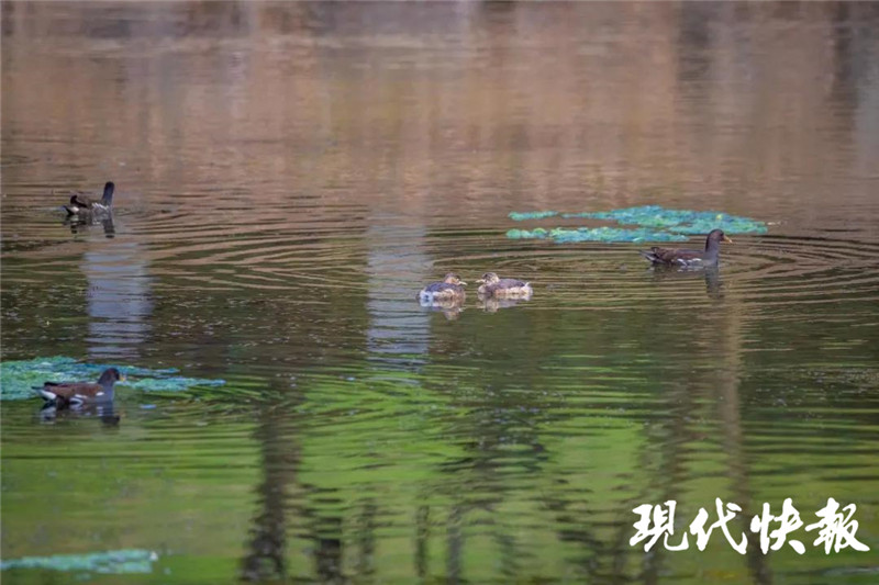 外形和鴨子一樣的䴙䴘比較常見,全湖可見。它們比較膽小,常常在蘆葦叢中營巢,或者成群在水上游蕩。通體黑褐色的黑水雞多在荷花種植區(qū)內(nèi)活動(dòng)。