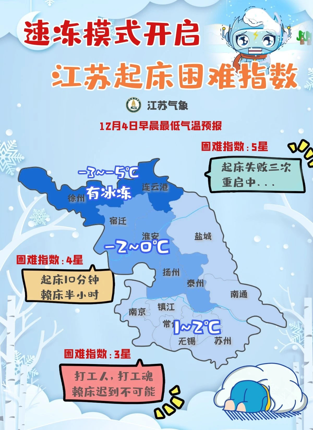 入冬以來最低氣溫將出現(xiàn),“速凍”模式開啟!根據(jù)對4日早晨的最低氣溫預報,江蘇氣象還發(fā)布了起床困難指數(shù)圖,看看你家屬于幾顆星?現(xiàn)代快報記者注意到,位于淮北的徐州、連云港-3℃到-5℃,有冰凍,起床困難指數(shù)最高,有5星,可算是起床“特困戶”;宿遷、淮安、揚州、泰州等地-2℃到0℃,咬咬牙起床10分鐘、賴床半小時,困難指數(shù)4星;南通、南京、鹽城及沿江蘇南等地最低1℃到2℃,起床困難指數(shù)3星,正常起床還是可以做到的。