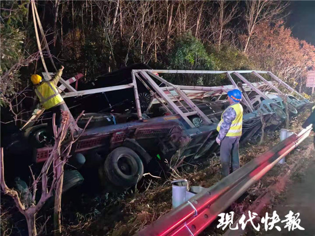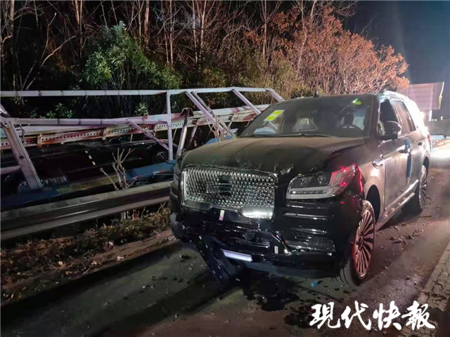 12月9日18時許,接到報(bào)警后民警到達(dá)事故現(xiàn)場,發(fā)現(xiàn)一輛15米多長的運(yùn)輸車側(cè)翻在護(hù)欄外的綠化帶,車頭已經(jīng)凹下去了一半,運(yùn)輸?shù)?輛林肯SUV已經(jīng)被甩出,損壞嚴(yán)重,應(yīng)急車道邊上的護(hù)欄也被撞得脫落,現(xiàn)場一片狼藉。