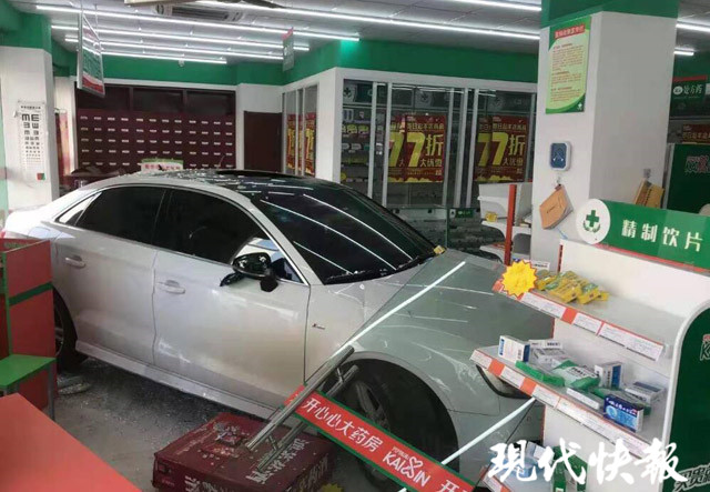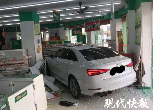 經(jīng)了解,駕駛奧迪車的是56歲的常熟本地男子王某某,其剛拿到駕駛證才2個月,尚處在實習期,車輛也是剛買不久。事發(fā)時,王某某在藥房門口準備停車,本已放慢了速度,但在操作時錯將剎車當成油門踩下,車輛直接撞碎玻璃門沖進了藥房。好在藥房中央有個柱子,車輛在撞上柱子后停了下來。