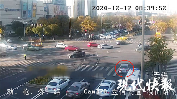 △ 小轎車越過停止線左轉(zhuǎn)停在了斑馬線上,為后方救護(hù)車讓開一條生命通道。 無錫交警供圖