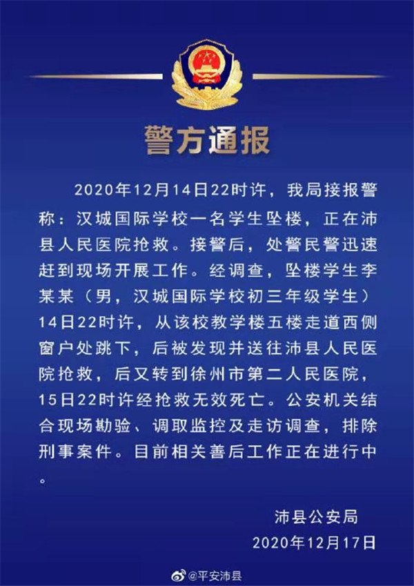 通報(bào)稱,12月14日22時(shí)許,公安局接報(bào)警稱:漢城國(guó)際學(xué)校一名學(xué)生墜樓,正在沛縣人民醫(yī)院搶救。經(jīng)調(diào)查,墜樓學(xué)生李某某(男,漢城國(guó)際學(xué)校初三年級(jí)學(xué)生)14日22時(shí)許,從該校教學(xué)樓五樓走道西側(cè)窗戶處跳下,后被發(fā)現(xiàn)并送往沛縣人民醫(yī)院搶救,后又轉(zhuǎn)到徐州市第二人民醫(yī)院,15日22時(shí)許經(jīng)搶救無(wú)效死亡。公安機(jī)關(guān)結(jié)合現(xiàn)場(chǎng)勘驗(yàn)、調(diào)取監(jiān)控及走訪調(diào)查,排除刑事案件。目前相關(guān)善后工作正在進(jìn)行中。