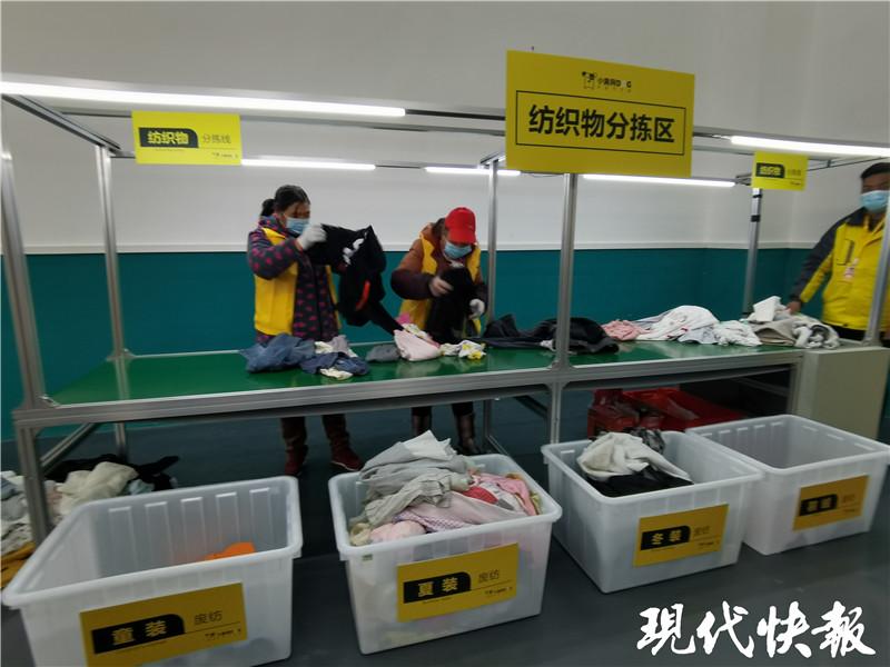 分揀中心每天最高可以分揀處理10 噸可回收物,這些可回收物會(huì)通過分揀線進(jìn)行更細(xì)化的分類。比如,廢紙可以分成黃紙,花紙和書紙三大類。舊衣物在這里分揀后,按品質(zhì)分級(jí)分類回收,用新技術(shù)做成手套、環(huán)保袋、保溫棉、路基布、擦機(jī)布等。
