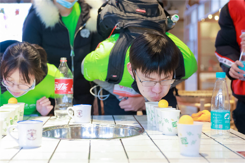 在泰山廟打卡點,選手需要抽取“中國”“鐵軍”“濕地”等題面,用“神筆馬良”毛筆道具,大家一起寫下相應(yīng)文字。“我以前練過毛筆字,這關(guān)對我來說小case。”來自鹽城工學(xué)院的幾位同學(xué)知道指令后,立即沖上前合力完成了任務(wù)。