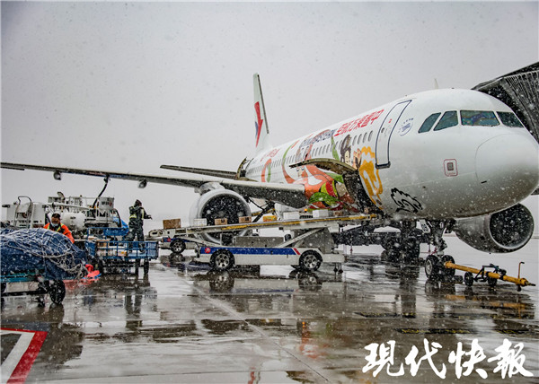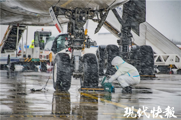 △ 南京機(jī)場(chǎng)工作人員風(fēng)雪中作業(yè)