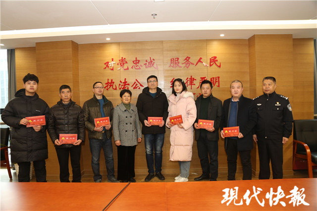 1月6日上午9點(diǎn)半,除了3位熱心人因?yàn)橛惺?,其?人來到經(jīng)開區(qū)橫林交警中隊(duì),經(jīng)開區(qū)見義勇為基金會(huì)對(duì)他們進(jìn)行了集體表彰和獎(jiǎng)勵(lì)。