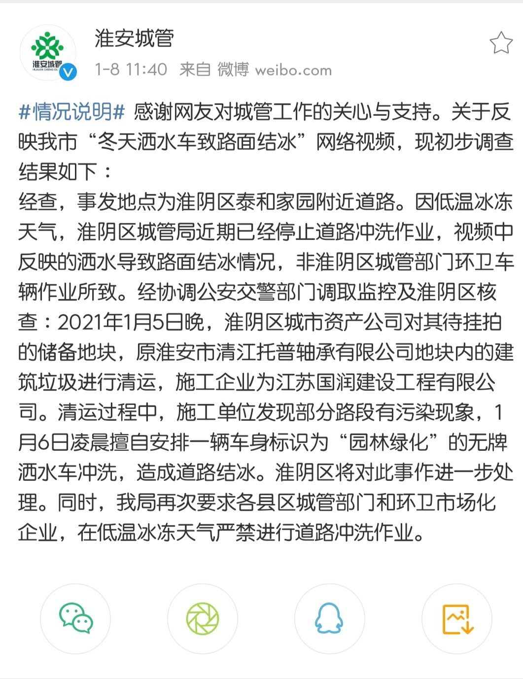 淮安城管表示,經(jīng)查,事發(fā)地點(diǎn)為淮陰區(qū)泰和家園附近道路。因低溫冰凍天氣,淮陰區(qū)城管局近期已經(jīng)停止道路沖洗作業(yè),視頻中反映的灑水導(dǎo)致路面結(jié)冰情況,非淮陰區(qū)城管部門(mén)環(huán)衛(wèi)車(chē)輛作業(yè)所致。經(jīng)協(xié)調(diào)公安交警部門(mén)調(diào)取公共視頻及淮陰區(qū)核查發(fā)現(xiàn),1月5日晚,淮陰區(qū)城市資產(chǎn)公司對(duì)其待掛拍的儲(chǔ)備地塊,原淮安市清江托普軸承有限公司地塊內(nèi)的建筑垃圾進(jìn)行清運(yùn),施工企業(yè)為江蘇國(guó)潤(rùn)建設(shè)工程有限公司。清運(yùn)過(guò)程中,施工單位發(fā)現(xiàn)部分路段有污染現(xiàn)象,1月6日凌晨擅自安排一輛車(chē)身標(biāo)識(shí)為“園林綠化”的無(wú)牌灑水車(chē)沖洗,造成道路結(jié)冰。
