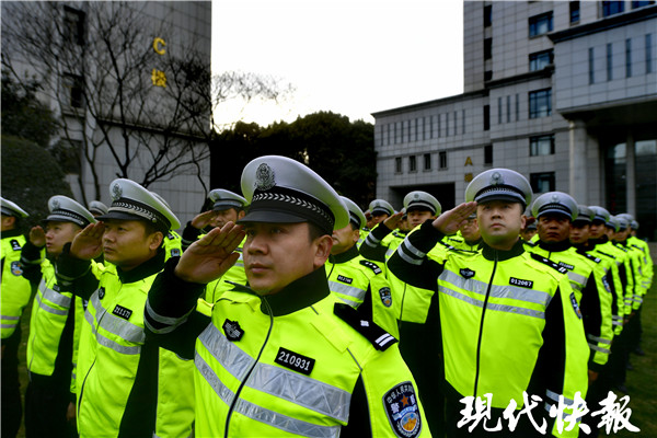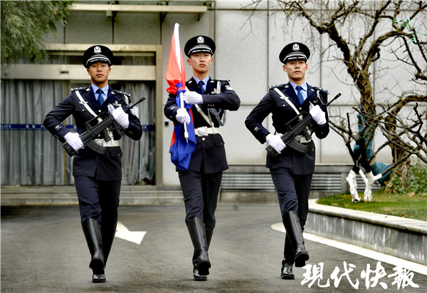 1月10日,室外零下5℃的寒風(fēng)里,來自江蘇省公安廳特勤局的警旗護(hù)衛(wèi)隊正護(hù)衛(wèi)著人民警察警旗,向公安廳大院的旗桿行進(jìn),中間的擎旗手手擎警旗,兩名護(hù)旗手分列左右,現(xiàn)場觀眾行注目禮。