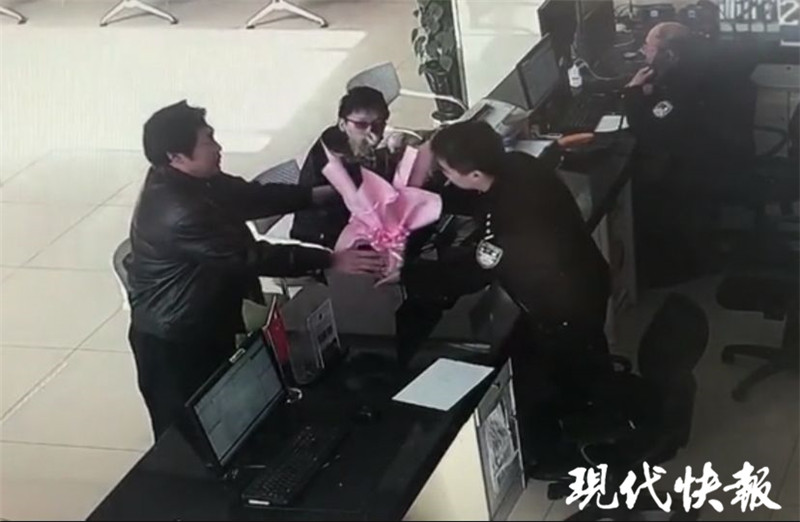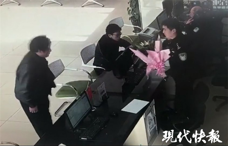 現(xiàn)代快報記者了解到,這感人一幕,被大廳的公共視頻全程記錄了下來。當(dāng)天上午11時30分許,虹橋派出所接待大廳,正在窗口解答群眾咨詢的副所長黃鵬看到,一名50多歲的男子手捧一束鮮花走了進來。