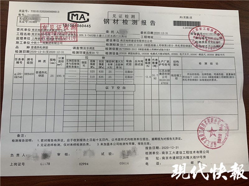 與此同時,南京地鐵集團立即對視頻涉事批次鋼筋的檢測報告進行核實。該報告由南京工大建設工程技術有限公司于2020年12月31日出具。報告顯示:樣品經檢驗,拉伸性能、彎曲性能、重量偏差符合國標。據(jù)施工方介紹,他們對施工材料進場有嚴格的把關流程,施工材料進場后,由監(jiān)理單位和施工單位進行初步驗收,經監(jiān)理工程師見證取樣送專業(yè)機構檢測合格后,方可使用。此事發(fā)生后,南京市建委軌道站立即委托專業(yè)檢測機構對該批次鋼筋進行復檢,檢測結果合格,符合國標。