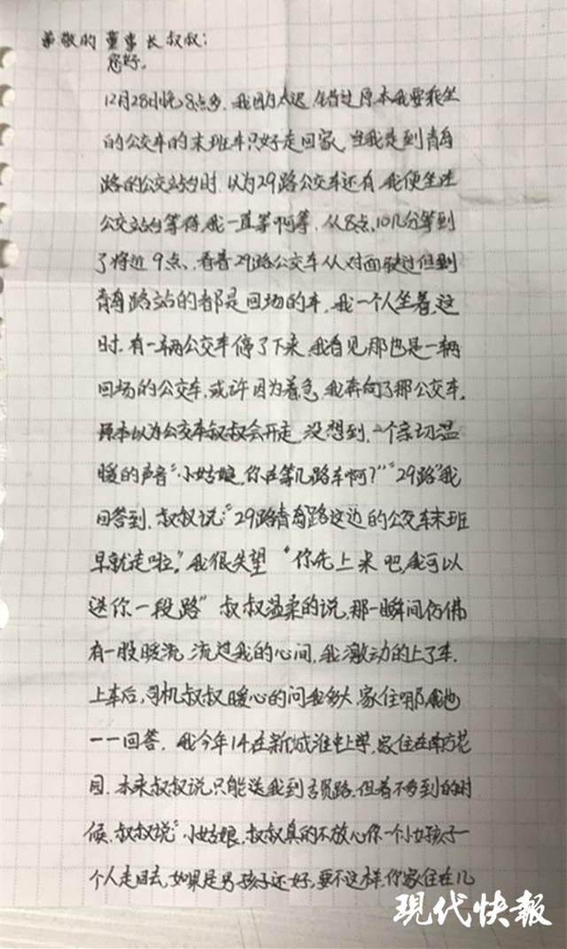 “小姑娘,你在等幾路車啊?”“29路青島路這邊的公交車末班車早就走啦。”“你先上來吧,我可以送你一段路。”“小姑娘,叔叔真的不放心你自己走回去,我把你送回去吧。”……信中,女孩回憶了司機對她說的每一句話,用真誠質樸的語言描述了駕駛員叔叔對自己的關心,并表示誠摯的感謝。