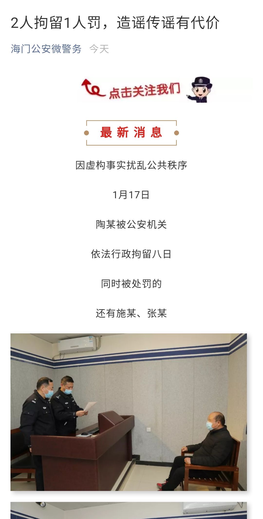 (記者 嚴(yán)君臣)1月17日,南通海門警方通過官方微信公眾號(hào)“海門公安微警務(wù)”發(fā)布一則消息。因虛構(gòu)事實(shí)擾亂公共秩序,1月17日,男子陶某被公安機(jī)關(guān)依法行政拘留八日,同時(shí)被處罰的還有兩名散播謠言的女子施某、張某。