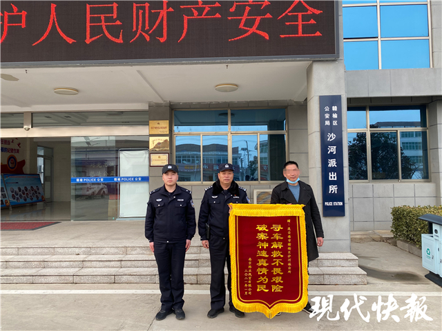 1月27日,受害人章先生專程從南京趕到贛榆,將一面錦旗送到沙河派出所。