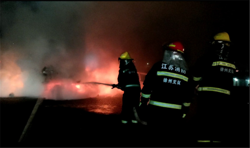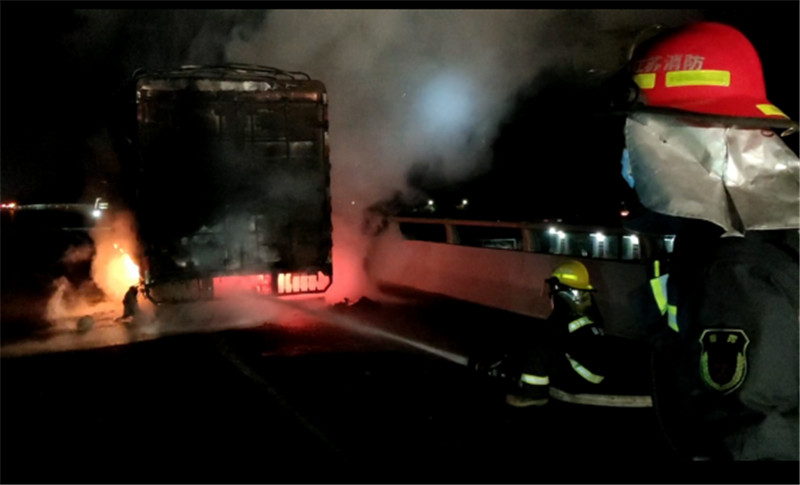 接到報(bào)警后,礦山路消防救援站趕赴現(xiàn)場(chǎng)處置。消防員到達(dá)現(xiàn)場(chǎng)后,發(fā)現(xiàn)高速公路養(yǎng)護(hù)人員已經(jīng)到場(chǎng)做好警戒,車(chē)廂部位已被大火包圍,火勢(shì)正在威脅油箱和車(chē)頭,高速路邊的草坪也被引燃。