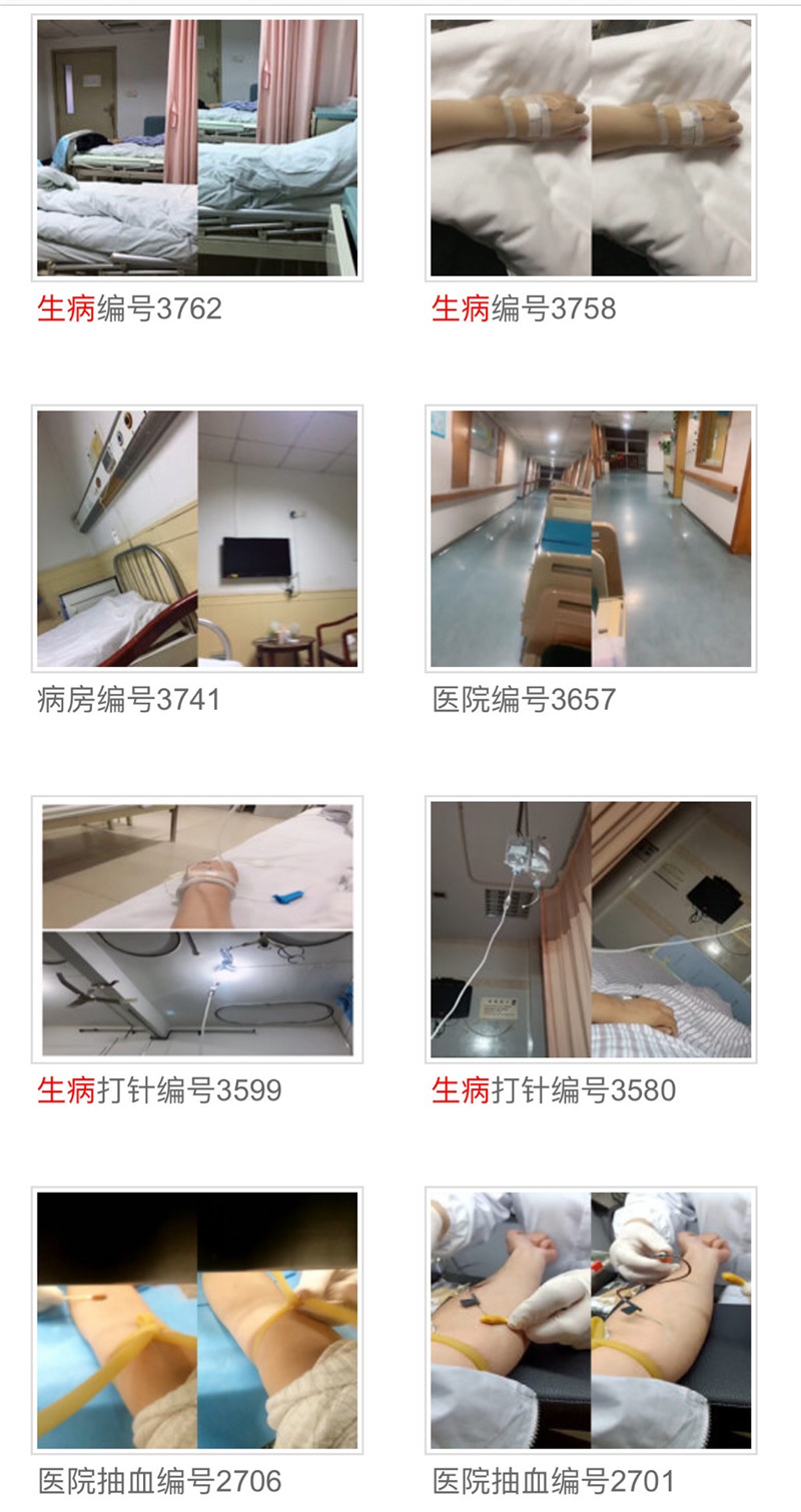 交談中,對(duì)方發(fā)給記者一條鏈接,點(diǎn)擊進(jìn)入,搜索“生病”,可以根據(jù)編號(hào)進(jìn)行購(gòu)買。記者看到,鏈接內(nèi)一共有39條視頻是和生病相關(guān),有正在輸液、躺在病床、抽血、掛號(hào)排隊(duì)、骨折打石膏等不同主題的視頻可供選擇,不過(guò)視頻都被打上了水印。