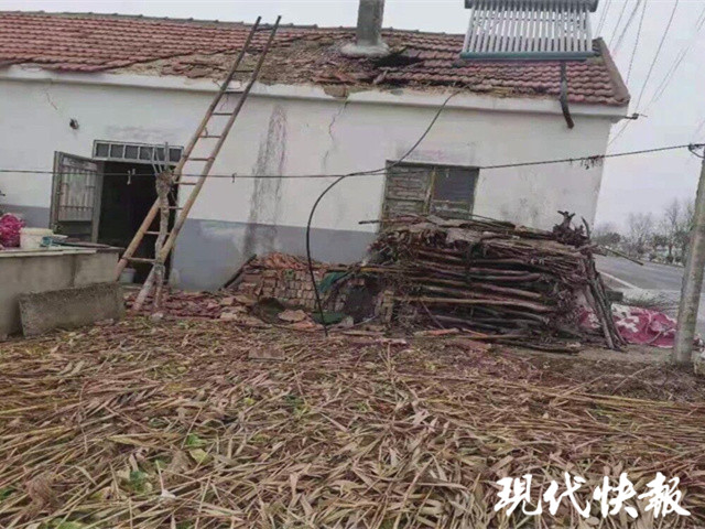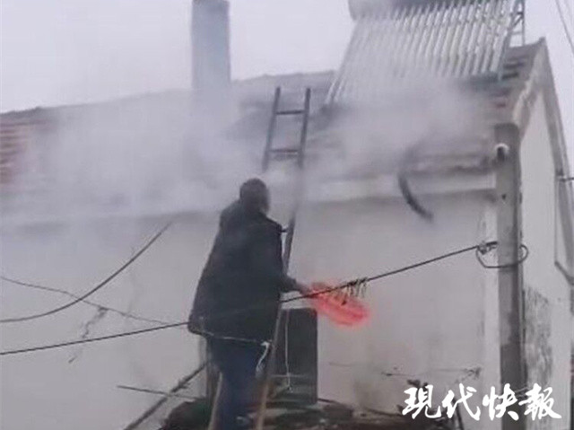 事發(fā)在1月26日中午12點(diǎn)多鐘。記者從射陽(yáng)縣海河鎮(zhèn)躍華村村民拍攝的視頻里看到,一間民房的屋頂冒出滾滾濃煙,一名青年男子爬在竹梯子上,下面不停有老人用盆接水端給他,他再將水潑到房頂上。