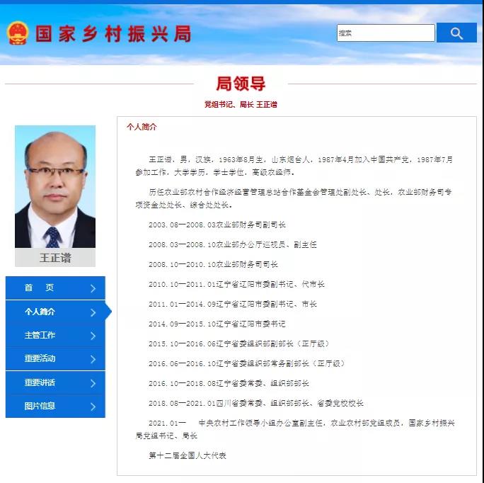 據(jù)官網(wǎng)顯示,王正譜在今年1月已擔(dān)任中央農(nóng)村工作領(lǐng)導(dǎo)小組成員兼辦公室副主任,農(nóng)業(yè)農(nóng)村部黨組成員,國家鄉(xiāng)村振興局黨組書記、局長。他此前的公開職務(wù)為四川省委常委、組織部部長、省委黨校校長。