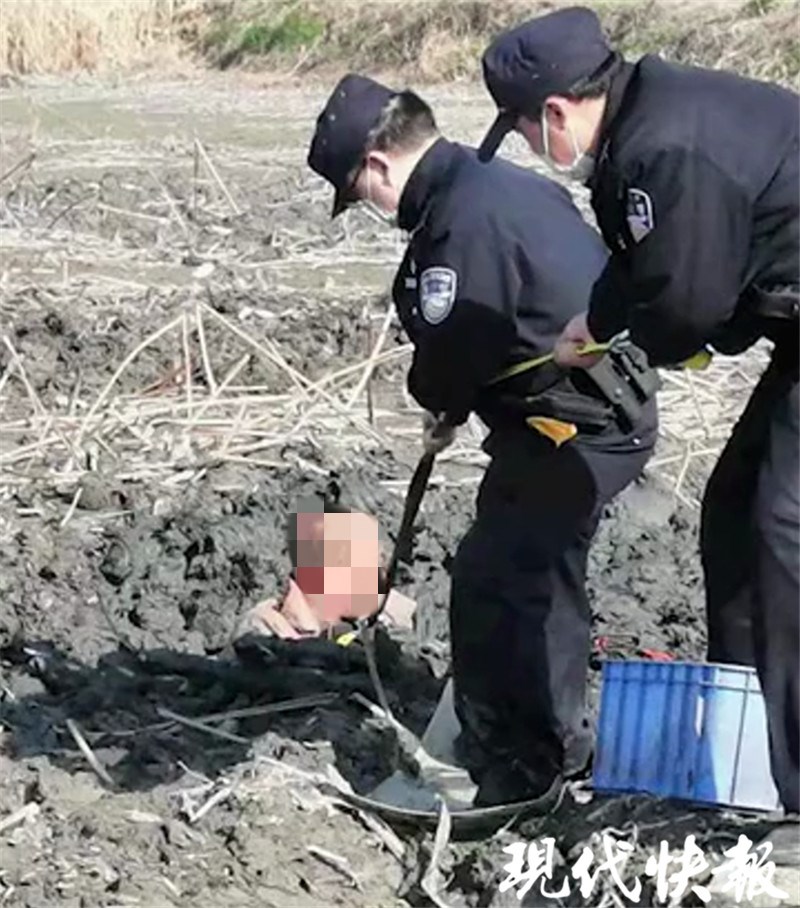 接警后,派出所立即組織警力,帶好救援裝備火速趕往現(xiàn)場。民警到達現(xiàn)場后發(fā)現(xiàn)老人已深陷淤泥之中,淤泥已經(jīng)沒過其胸口。