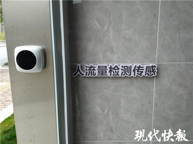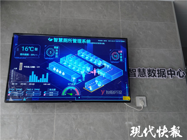 記者看到,在公廁入口的大門兩側(cè),設(shè)置了人流量監(jiān)測儀,門內(nèi)墻面上安裝了智慧廁所管理系同大屏,只要有人進入,“今日總?cè)肆髁?rdquo;數(shù)據(jù)就會增加。廁所建設(shè)單位技術(shù)人員介紹,人流量的數(shù)據(jù)會實時傳輸?shù)胶笈_,環(huán)衛(wèi)管理部門可以調(diào)取這些數(shù)據(jù),并根據(jù)數(shù)據(jù)分析出流量峰值,便于管理員保潔。除此以外,廁所使用情況也能在大屏上看到。