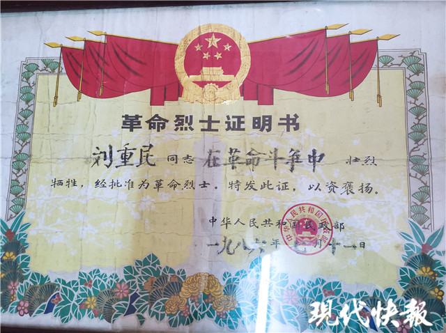 △劉重民烈士的革命烈士證明書