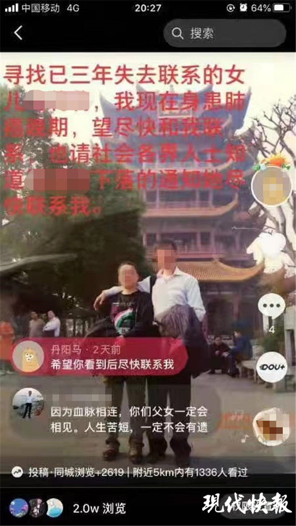 (通訊員 王國禹 虞瑜方 記者 曹德偉)5年前,鎮(zhèn)江丹陽女孩曉麗(化名)負氣離家出走,此后杳無音信。5年后,父親身患癌癥,想在有生之年找到女兒,可卻怎么也聯(lián)系不上。無奈之下,求助到轄區(qū)派出所。民警靈機一動,將父女的合照拍成了短視頻,沒想到經過一個多月的傳播,竟真的幫助這對父女團圓了。