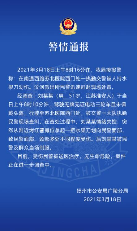 當(dāng)天中午,轄區(qū)揚(yáng)州市公安局廣陵分局發(fā)布警情通報(bào)。根據(jù)該通報(bào)稱,經(jīng)查當(dāng)日上午8時(shí)10份許,51歲的劉某某(江蘇淮安人),駕駛無(wú)牌無(wú)證電動(dòng)三輪車且未佩戴頭盔,行駛至蘇北醫(yī)院西門處,被交警一大隊(duì)執(zhí)勤民警現(xiàn)場(chǎng)查糾。在查處過程中,劉某某情緒失控,突然從附近烤紅薯攤位拿起一把水果刀劃向民警面部,導(dǎo)致民警面部、頸部多處不同程度受傷。后劉某某被民警及群眾當(dāng)場(chǎng)制服。