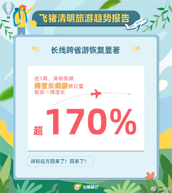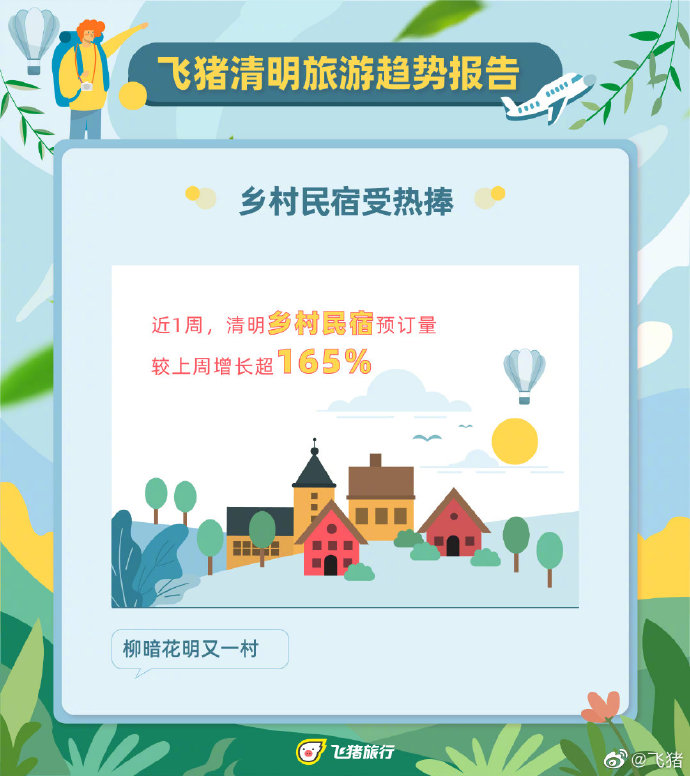 現(xiàn)代快報(bào)記者從飛豬旅行了解到,近一周,清明機(jī)票預(yù)訂量比上一周增長了150%,鄉(xiāng)村民宿預(yù)訂量較上周增長超165%,跨省長線游預(yù)訂量較上周增長超170%,北上廣等位列清明熱門入住城市全國前十。
