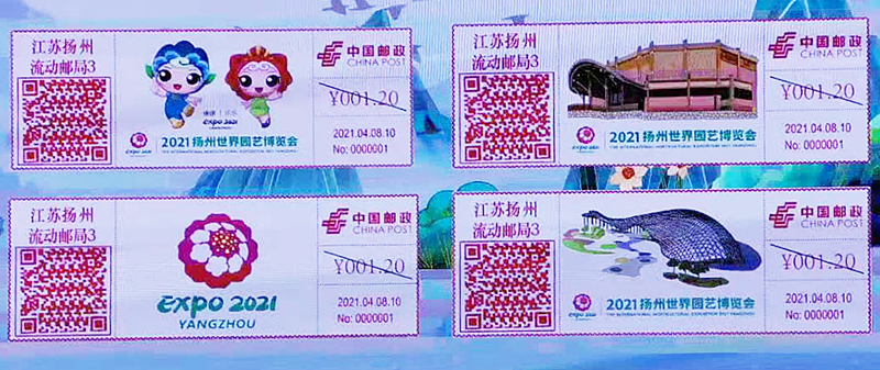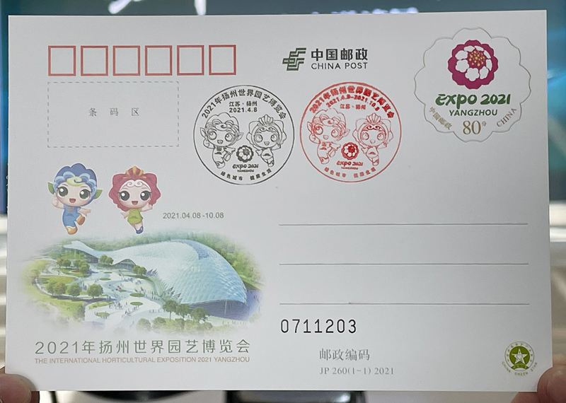 現(xiàn)代快報(bào)記者了解到,經(jīng)中國(guó)郵政集團(tuán)有限公司批準(zhǔn),揚(yáng)州流動(dòng)郵局于2021年4月8日正式啟用"2021揚(yáng)州世界園藝博覽會(huì)"彩色郵資機(jī)戳一組4枚。明信片封面左下角為統(tǒng)一的世園會(huì)吉祥物“康康”“樂(lè)樂(lè)”圖案以及世園會(huì)字樣、會(huì)徽,不同的是右上角,4枚內(nèi)容分別為"世園會(huì)會(huì)徽"、"世園會(huì)吉祥物"、"國(guó)際館"和"演藝館"。