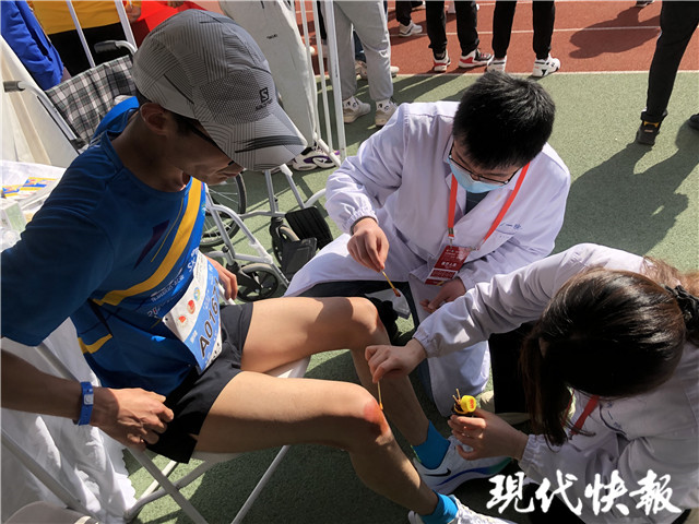 現(xiàn)場,穿著白大褂的醫(yī)務(wù)人員一直沒閑著。他們站在跑道旁邊,給抵達(dá)終點(diǎn)的選手遞水遞毛巾,看到有的選手不舒服或者膝蓋等地方破了,立馬給他們進(jìn)行治療、傷口處理。