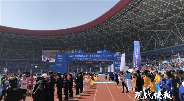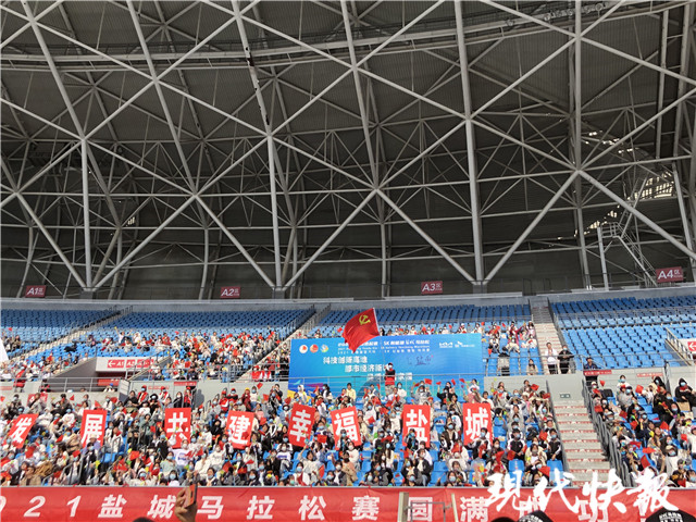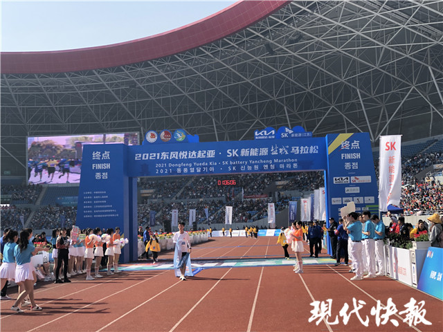 “半程馬拉松第一名即將抵達(dá)終點(diǎn),請?jiān)趫龅挠^眾一起為他加油吶喊!”在終點(diǎn)——鹽南體育中心體育場,隨著主持人對賽況的持續(xù)播報(bào),現(xiàn)場的觀眾歡呼著迎接半馬第一名沖線。