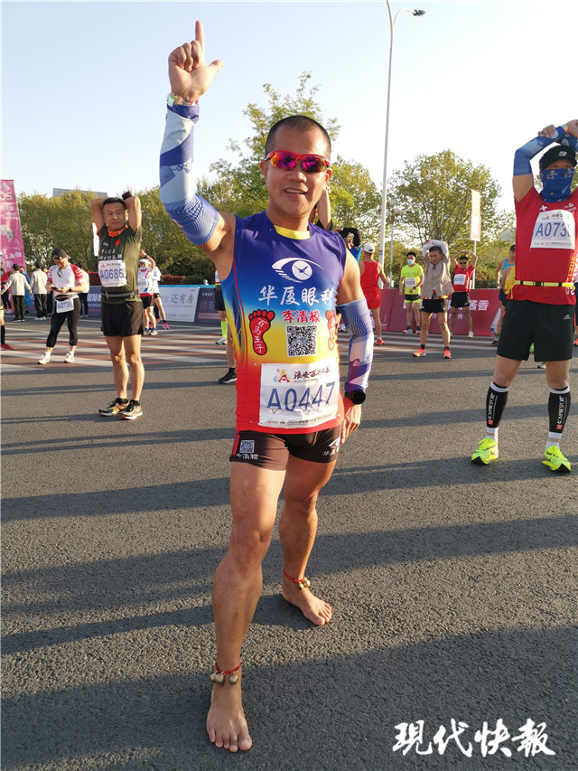 “這是我參加的第158場(chǎng)馬拉松,他們都叫我赤腳大仙,因?yàn)楣饽_跑更接地氣,能感受自然,腳脖子上系的鈴鐺也是保佑平安。”在馬拉松起點(diǎn),來(lái)自廈門(mén)的李清模正光著腳做賽前準(zhǔn)備。他告訴記者,每一場(chǎng)馬拉松他都光著腳系著鈴鐺,希望自己能取得較好名次。