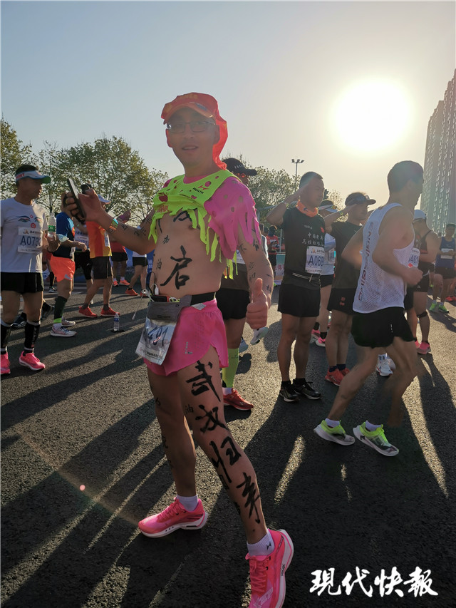 一名渾身寫(xiě)滿“武漢歸來(lái)”“牢記使命”“加油”字樣的男子吸引了不少人的目光。他告訴記者,他已經(jīng)參加了百余場(chǎng)馬拉松,身上的字是自己彩繪的,這次從武漢來(lái)淮安參賽,其中一個(gè)原因就是感謝江蘇人對(duì)武漢人民的援助。他知道淮安是周恩來(lái)總理的故鄉(xiāng),趁著鍛煉身體的好機(jī)會(huì),正好領(lǐng)略淮安的美好風(fēng)光。