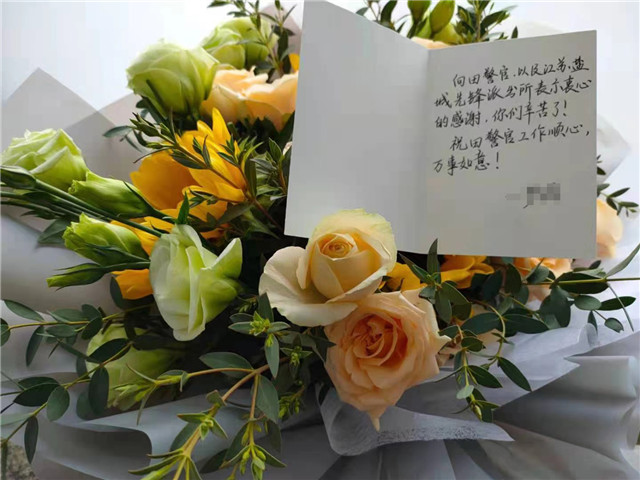 “向田警官以及江蘇鹽城先鋒派出所表示衷心的感謝,你們辛苦了!”4月24日一大早,許女士手捧鮮花和手寫(xiě)的卡片,從河南老家專程趕到鹽城市公安局亭湖分局先鋒派出所,對(duì)幫她追回2萬(wàn)余元錢款的民警表達(dá)謝意。