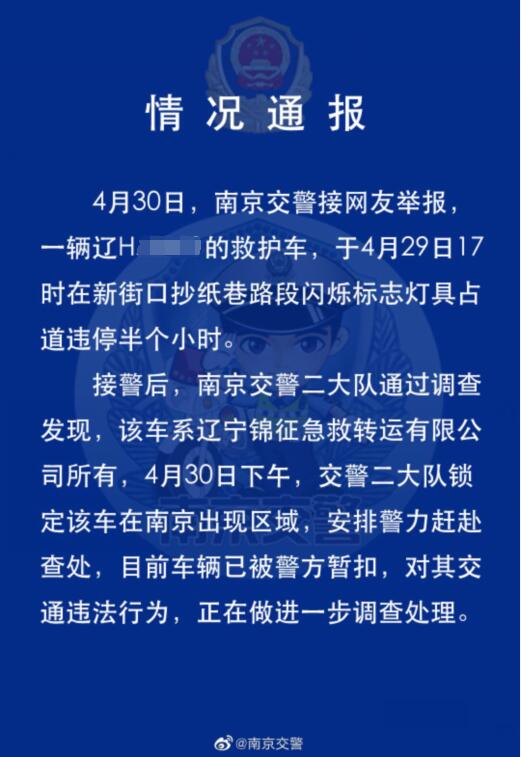 (記者 王瑞)4月29日,南京一牌照為遼H開(kāi)頭的救護(hù)車開(kāi)啟警報(bào)燈長(zhǎng)時(shí)間占道搬家導(dǎo)致交通堵塞的視頻引起網(wǎng)友熱議。對(duì)此,南京交警二大隊(duì)通過(guò)調(diào)查發(fā)現(xiàn),該車系遼寧錦征急救轉(zhuǎn)運(yùn)有限公司所有。