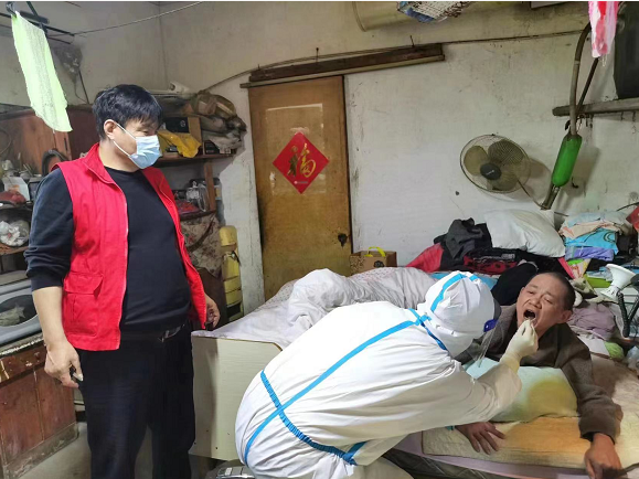 今年49歲季云東,因一次事故導致雙腿截肢,高位殘疾。從7日開始,通州區(qū)開展全民核酸檢測工作,這可難住了季云東。作為虹西村的當家人,始終把弱勢群體牽掛于心。他堅持每天帶著核酸檢測人員為季云東上門服務。