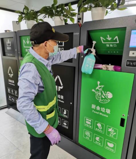 組織督導(dǎo)員、志愿者每日定時針對小區(qū)內(nèi)環(huán)保屋、垃圾亭的設(shè)施、垃圾桶進行日常保潔消殺工作。集中消毒清洗,利用消毒液無死角全覆蓋噴灑清洗垃圾桶。