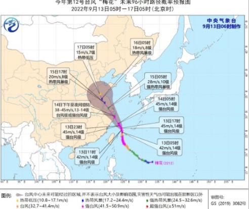 9月12日14點(diǎn),今年第12號臺風(fēng)“梅花”(臺風(fēng)級)的中心在位于浙江省舟山市南偏東方向約610公里洋面上(北緯24.7度、東經(jīng)124.0度),中心附近最大風(fēng)力有13級(40米/秒),中心最低氣壓為960百帕。預(yù)計(jì)“梅花”將以每小時(shí)5—10公里的速度向偏北方向緩慢移動,強(qiáng)度變化不大,逐漸向浙江東北部沿海靠近,并可能于14日夜間至15日白天登陸或擦過上述沿海地區(qū)。