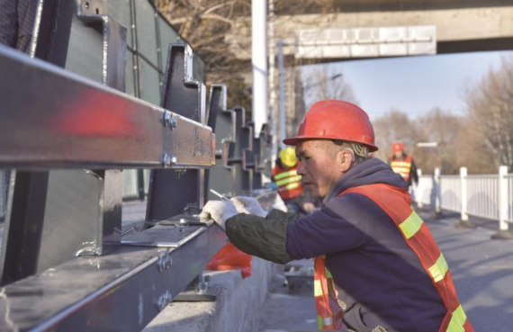 1月29日,工人在天橋路跨鐵路橋上安裝新型SS級(jí)防撞護(hù)欄。這種防撞護(hù)欄壁厚達(dá)7毫米,由15×12厘米的大口徑方管及構(gòu)件組成,主要用于鐵路橋梁。目前正首次在鎮(zhèn)江城區(qū)的天橋路跨鐵路橋及解放路跨鐵路橋上安裝施工。