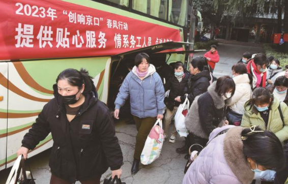 1月29日,經(jīng)過近5個小時的車程,鎮(zhèn)江京口區(qū)2023年“創(chuàng)響京口”春風(fēng)行動“點對點”專車接回的38名安徽宿州首批返崗人員順利抵達江蘇惠通集團宿舍區(qū)。京口區(qū)人社部門工作人員為返崗員工送上了“春風(fēng)卡”“就業(yè)創(chuàng)業(yè)政策匯編”等材料。王呈 莊嚴 攝影報道