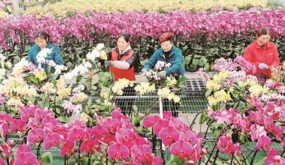 近日,沭陽(yáng)縣耿圩鎮(zhèn)潤(rùn)成蘭花盆景產(chǎn)業(yè)園里蝴蝶蘭迎春綻放,員工們?cè)趯?duì)蝴蝶蘭進(jìn)行組盆銷(xiāo)售。
