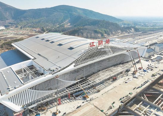 滬寧沿江高鐵近日實(shí)現(xiàn)全線鋪軌貫通,為今年9月具備開(kāi)通運(yùn)營(yíng)條件奠定堅(jiān)實(shí)基礎(chǔ)。圖為正在施工中的江陰站。 通訊員 趙應(yīng)強(qiáng) 記者 邵丹 攝