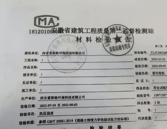 蕪湖市排水管理處提供的另一份南京公司產(chǎn)品的抗壓強(qiáng)度檢測(cè)報(bào)告,由安徽省建筑工程質(zhì)量第二監(jiān)督檢測(cè)站出具,委托單位為西安愛(ài)斯格環(huán)??萍加邢薰?。知情人說(shuō),這份檢測(cè)報(bào)告也是假的。記者與安徽省建筑工程質(zhì)量第二監(jiān)督檢測(cè)站取得了聯(lián)系,這里的工作人員告訴記者,這份檢測(cè)報(bào)告是安徽當(dāng)?shù)匾患移髽I(yè)委托檢測(cè)的,根本就不是西安的企業(yè)委托。