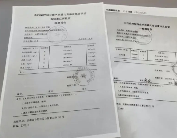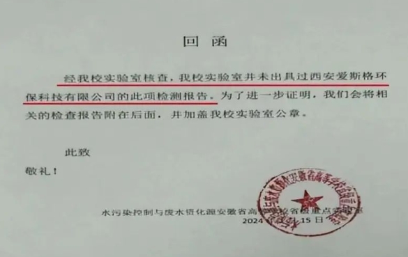 報(bào)審表中另一份水質(zhì)檢測(cè)報(bào)告,同樣顯示:委托單位為西安愛(ài)斯格環(huán)??萍加邢薰?,出具單位為:水污染控制與廢水資源化安徽省高等學(xué)校省際重點(diǎn)實(shí)驗(yàn)室。記者核實(shí),該單位也沒(méi)有出具過(guò)此報(bào)告,對(duì)方給記者的回函寫明:“經(jīng)我校實(shí)驗(yàn)室核查,我校實(shí)驗(yàn)室并未出具過(guò)西安愛(ài)斯格環(huán)??萍加邢薰镜拇隧?xiàng)檢測(cè)報(bào)告。”