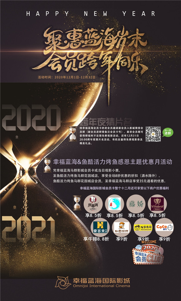 一、 持幸福藍(lán)海會(huì)員卡的老會(huì)員邀請(qǐng)新會(huì)員入影城微信會(huì)員群(新會(huì)員進(jìn)群需備注會(huì)員卡號(hào)),新老會(huì)員都可獲得群福利不定期免費(fèi)觀影活動(dòng),還有12月31日20:00跨年夜猜片名活動(dòng),有機(jī)會(huì)贏得免費(fèi)觀影券及精美禮品。