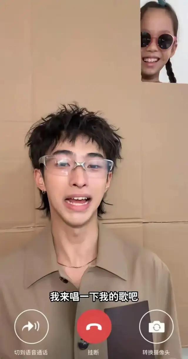只見在恩利的視頻中,兄妹倆宣傳整活,拿著一個(gè)紙板子假裝視頻聊天。恩利戴著眼鏡打扮很青春少年,穿著卡其色的睡衣正襟危坐邀請(qǐng)自己的妹妹米粒上線,而9歲的米粒梳著拳擊辮戴著搞怪的墨鏡,在鏡頭前表演型人格拉滿,兄妹倆打歌演出小品既視感。