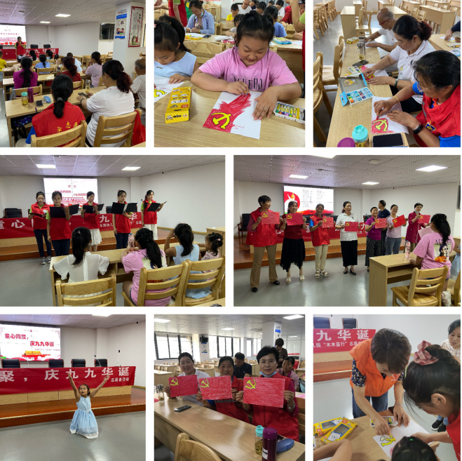 活動(dòng)開始,首先由老黨員分享《我和共產(chǎn)黨的故事》。在座的孩子們都紛紛表示,要好好學(xué)習(xí),繼承我黨優(yōu)秀傳統(tǒng),練就硬本領(lǐng),做建設(shè)祖國(guó)的合格接班人。接著是志愿者共同朗誦《七月的天空》詩(shī)歌,使大家知道七月的天空格外紅,它是九十九年無數(shù)革命英雄拋頭顱灑熱血換來的,今天我們?cè)谄咴碌奶炜障拢拺严攘?,感恩中?guó)共產(chǎn)黨。為了讓孩子們對(duì)中國(guó)共產(chǎn)黨有更深刻的認(rèn)識(shí),志愿者老師又給大家認(rèn)真講解了黨旗的含義,孩子們聽得津津有味,都迫不及待的想親手繪畫黨旗。于是,社區(qū)老黨員、家長(zhǎng)及志愿者與孩子們一起共同攜手繪畫黨旗。當(dāng)一面面鮮紅的“黨旗”完成時(shí),大家高高舉起自己的作品,無比的開心與自豪!活動(dòng)最后,大家齊唱紅歌,有奶奶也有孩子伴舞,老少同臺(tái),童心同聚,為慶建黨九九華誕而歡呼著。