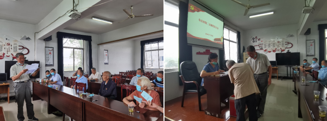 “我志愿加入中國共產(chǎn)黨,擁護黨的綱領(lǐng),遵守黨的章程......”參會黨員們誓言鏗鏘、承諾擲地,在一字一句中喚醒每一位黨員的初心,堅定投身共產(chǎn)主義的信念。活動中,村領(lǐng)導還以常識測試、知識問答的形式,以考促學,鼓舞和激勵廣大黨員和群眾回顧崢嶸歲月、銘記紅色歷史,進一步激發(fā)廣大黨員和群眾的愛黨愛國熱情。當前正值雨季,考試結(jié)束后,志愿者拿著提前準備好的愛心雨傘送給在座的老黨員們。讓老黨員們充分感受到志愿者的細心與黨組織的關(guān)懷。其中一位拿到雨傘的老黨員說道:“太感謝大家了,參加活動還給我們老黨員送小禮品,真有心!”