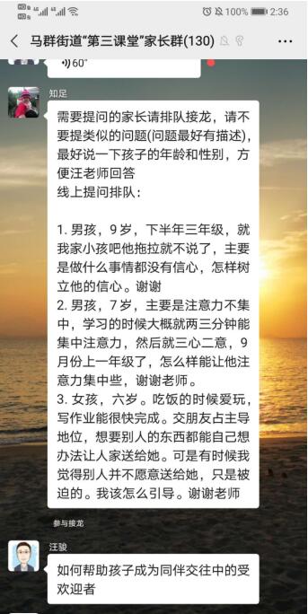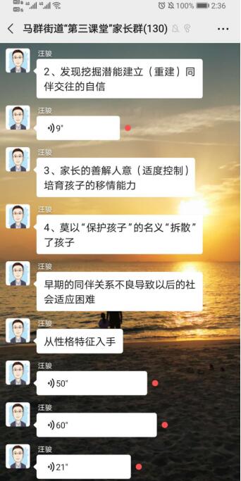 “家長如有什么疑問,在微信群內(nèi)留言,就可得到回復(fù)。”蛇盤社區(qū)以“共建、共享、共育”為理念,將提升家庭教育水平作為日常工作的重要部分,鏈接多方資源,助力“第三教室”。除了常規(guī)的家長課堂,社區(qū)黨總支還聯(lián)合幼兒園組建“馬群街道‘第三課堂’家長群”,線上開課,幫助家長充電增能。指導(dǎo)老師汪駿通過語音授課的方式,教授家長們先進(jìn)的育兒知識,讓家長能夠利用閑暇時間充實教育理念,掌握育兒方法。其中,《如何幫助孩子成為同伴交往中的受歡迎者》、《家長應(yīng)把握的幼小銜接關(guān)鍵點(diǎn)》等課程受到了家長的歡迎。一位小朋友家長表示,她很喜歡這樣的線上學(xué)習(xí)交流,而線下的家長課堂,有時候不好意思提問。當(dāng)他在線上看到大家的提問時,才知道大家都有著相同的問題。因此,家長們有了專家老師的指導(dǎo),瞬間焦慮就“煙消云散”了。
