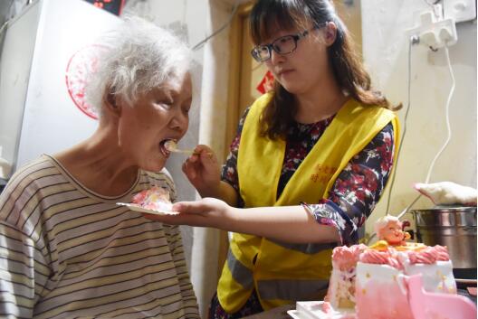 社區(qū)最初計(jì)劃將居家養(yǎng)老大廳布置布置,買上生日蛋糕,給老人唱生日歌一同慶賀。根據(jù)社區(qū)便民服務(wù)中心全科社工了解到的情況,劉爺爺?shù)睦习閮宏愑裣慊加芯袢?jí)殘疾,時(shí)而清醒、時(shí)而糊涂,經(jīng)常性犯病不吃不喝不睡,亂發(fā)脾氣,劉爺爺只能不分白天黑夜地照顧著、陪著她,日日如此,根本沒有自己的時(shí)間和空間??紤]到老人身邊離不開人照顧的情況,社區(qū)工作人員貼心的將“生日會(huì)場(chǎng)”挪到了老人家中,這一下,老兩口可開心了。劉爺爺將切下的第一塊蛋糕遞給了老伴兒,看著老伴兒心情好的吃著蛋糕,劉爺爺也十分開心,笑的合不攏嘴??粗惸棠套约撼缘馁M(fèi)勁,志愿者接過蛋糕盤,一口一口將蛋糕喂到老人的口中,為這對(duì)特殊的老夫妻過了一個(gè)特別的生日。